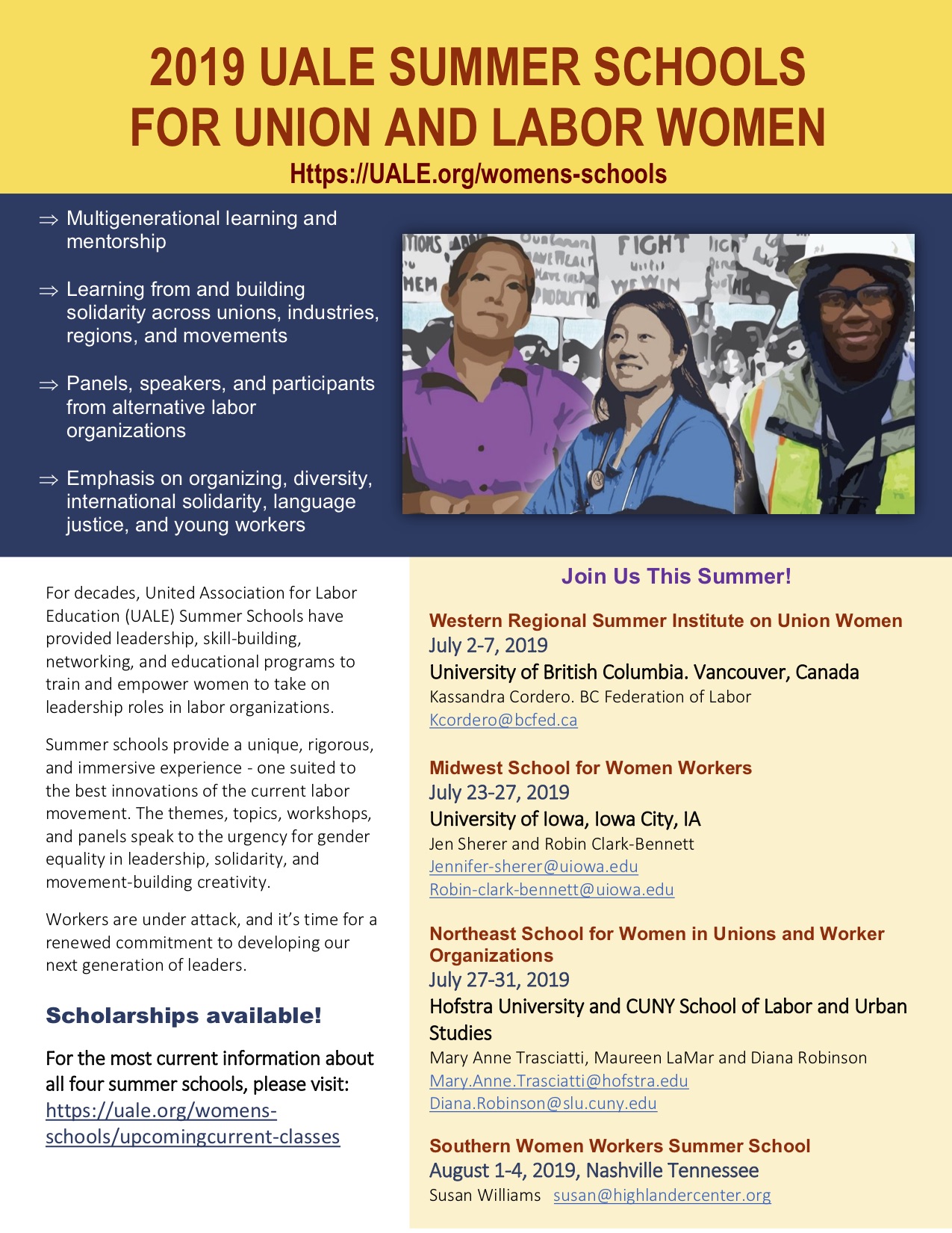 This year CLUW will provide one $500.00 scholarship to each of the United Association for Labor Education (UALE) Women’s Schools to help defray the costs of a participant to attend. Applicants must be a CLUW member or become a member by the time the application is submitted. Young women are encouraged to apply. Please find the application in a “WORD” version or in the PDF version.Applications must be submitted by Friday, May 31, 2019 to cluw@cluw.org or by fax to 202.508.6961 or mailed to: CLUW, ATTN: Women’s Schools, 815 16th Street, N.W., 2nd Floor, Washington, DC 20006. Please see the website article about those that attended in 2016.